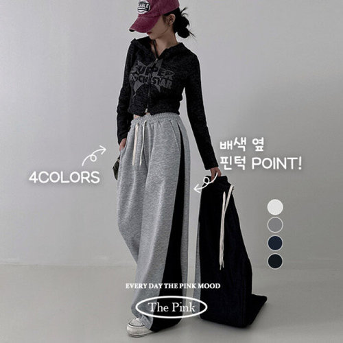 더핑크 / 루팀 옆 사이드 핀턱 배색 와이드 기모 트레이닝 팬츠