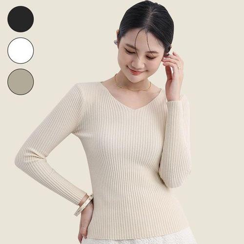 [에이치플러스몰]브이넥 골지 니트 여성 간절기 슬림핏 긴팔 무지티