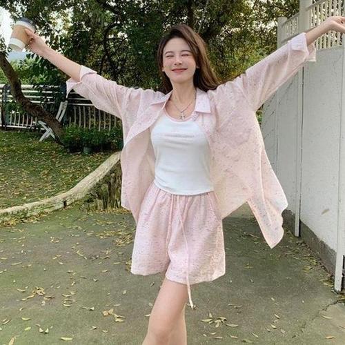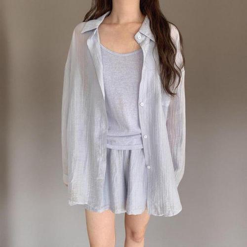 [신상오픈런]여성 여름 시스루 오버사이즈 셔츠 나시와 반바지 3종 패키지