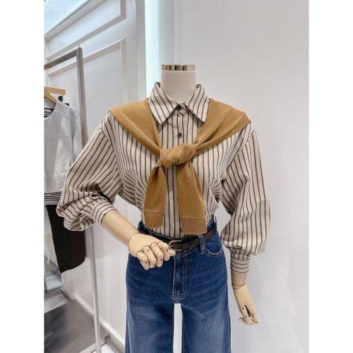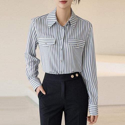 2025 가을 신상 여성 의류 캐주얼하고 세련되며 심플한 스트라이프 카라 긴팔 셔츠 탑