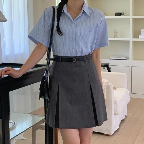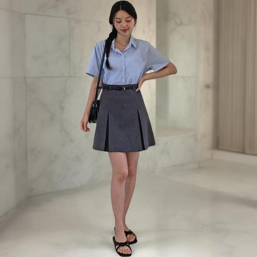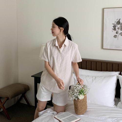 [옷자락]여자 클래식 스트라이프 자수 카라넥 반팔 남방