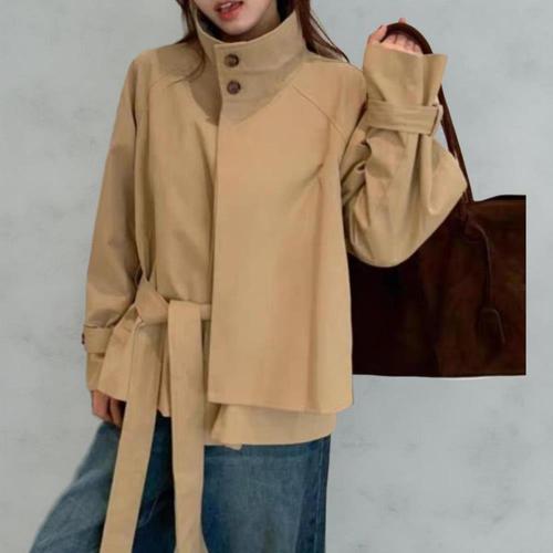 [옷자락] 여성 루즈핏 하이넥 뒷버튼 벨트 숏 트렌치 코트