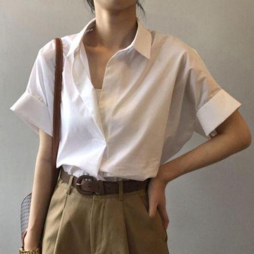 [에이치플러스몰]여자 인기 오픈 반팔 셔츠 감성 롤업 카라 흰 블라우