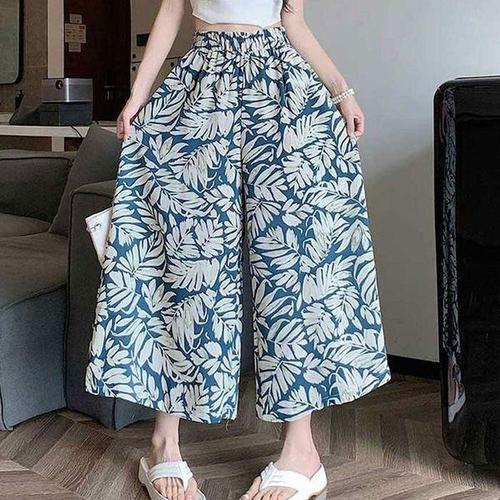 [에이치플러스몰]9부 와이드 팬츠 허리밴딩 여성 편한바지 나뭇잎패턴 데일리 바캉스룩