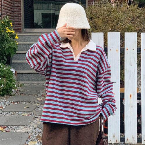 [옷자락]여자 오픈카라 배색 스트라이프 오버핏 힙커버 티셔츠