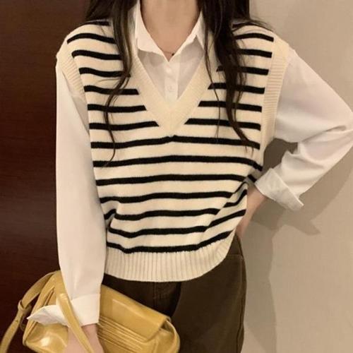 [엄지척]여성 단가라 니트 브이넥 캐주얼 린넨셔츠 77-D_19555184_667501