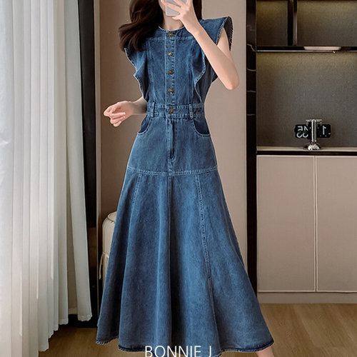보니제이 / 프릴 날개 민소매 슬림 A라인 청 데님 롱 원피스 (여