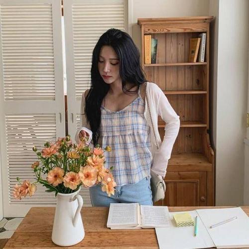 [에이치플러스몰]끈나시 쉬폰 여름 휴양지 체크 롱니트 크롭 플
