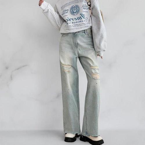 [옷자락]여자 구제 디스트로이드 워싱 와이드진 연청 청바지