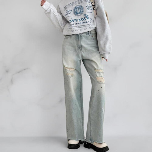 [신상오픈런]여자 구제 페인팅 컷팅 속밴딩 연청 와이드 청바지