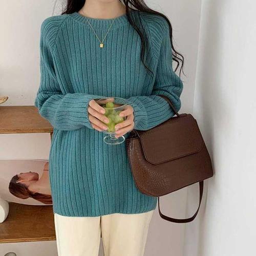 [에이치플러스몰]여성 옆트임 언발 루즈핏 골지 라운드넥 니트티셔츠