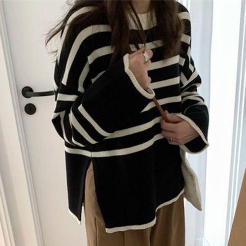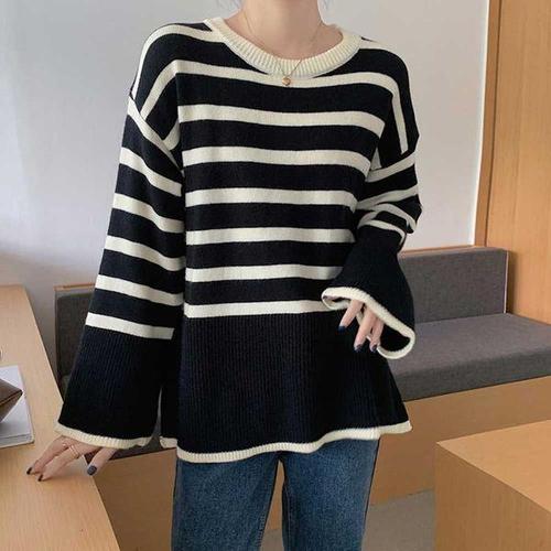 [에이치플러스몰]스트라이프 루즈핏 옆트임 긴팔 니트티 여성 롱니트
