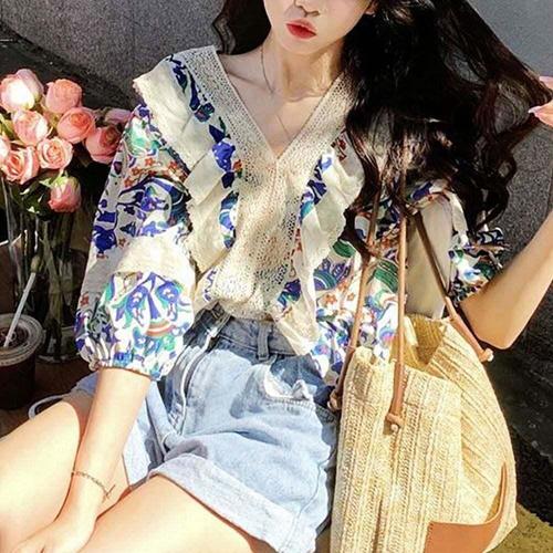 [모노무드]모노무드 예쁜 여름 반팔 브이넥 브라우스 여름블라우스 반팔블라우스 프릴