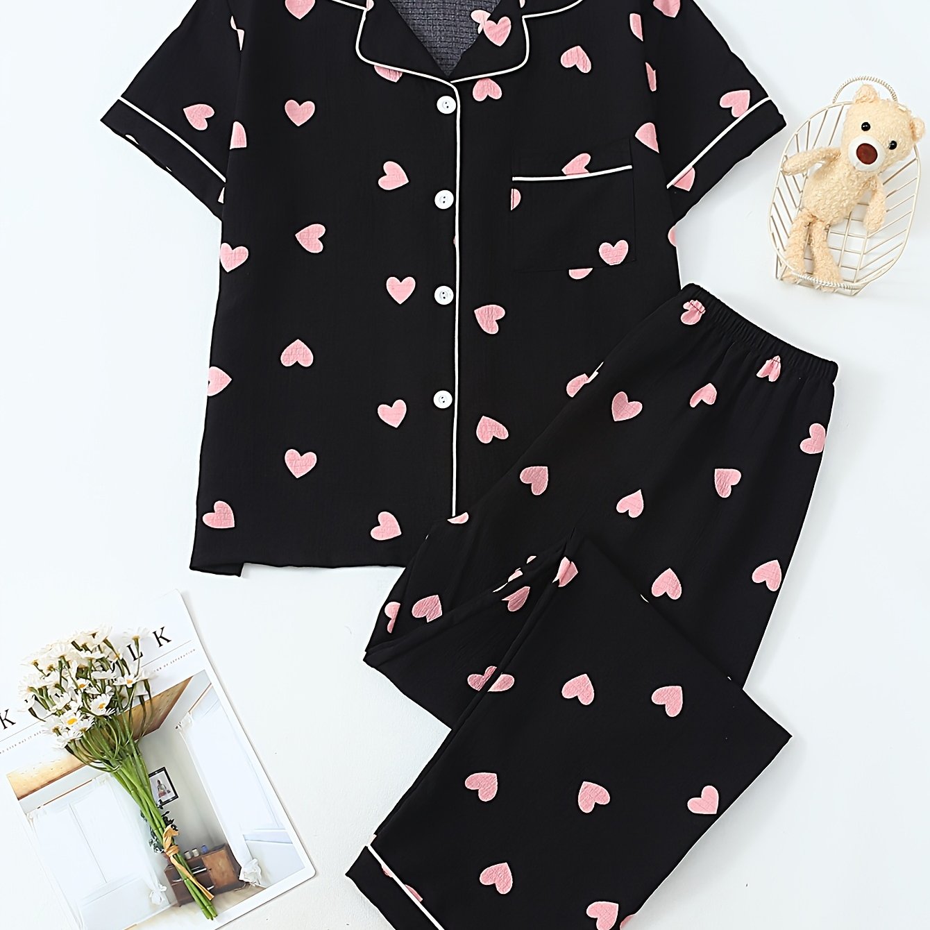TEMU 2피스 하트 프린트 여성 파자마 세트, 반팔 상의와 바지, 편안한 2피스 하트 프린트 라운지웨어, 라펠과 버튼 트림이 있는 가디건 캐주얼 홈 아웃핏