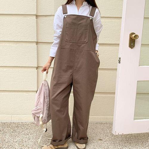 [옷자락]여자 빅사이즈 오버롤 포켓 멜빵 와이드 코튼 점프수트