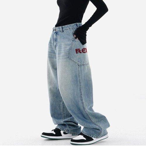 네모엔룩 벌룬인디고 남녀공용 와이드 뒷면 자수레터링 로우라이즈 루즈핏 레이어드룩 캐주얼 데님 청 팬츠