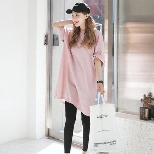 [굿쇼핑몰_의류]여리여리 파스텔 핑크 루즈핏 7부 반팔 롱 티셔츠