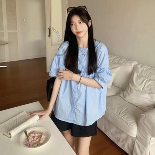 7부 퍼프 셔링 블라우스 면 라운드넥 루즈핏 여성 빅사이즈