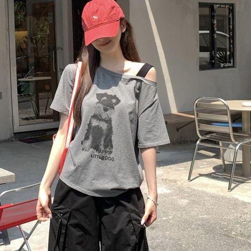 [옷자락]여성 데일리 오프숄더 크롭 반팔 티셔츠 스판 스트랩