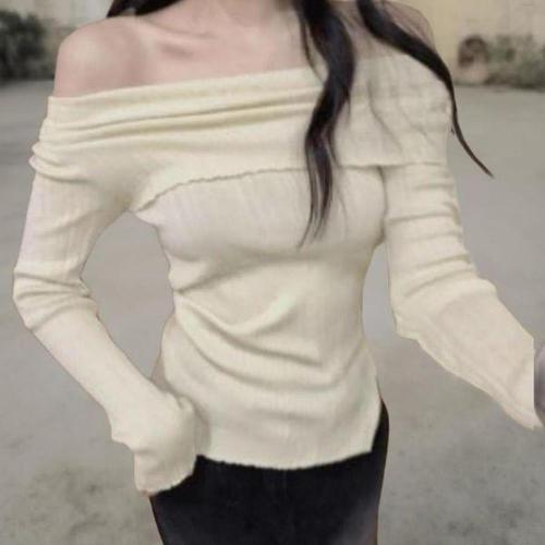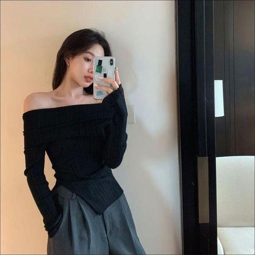 [신상오픈런]여성용 사랑스러운 오프숄더 언발란스 슬릿 긴팔 티셔츠