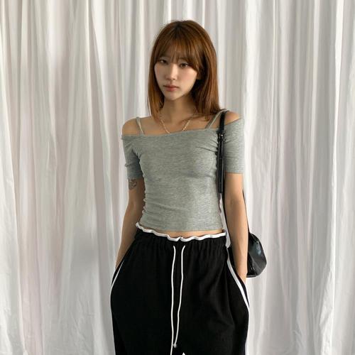 [옷자락] 여성 데일리 오프숄더 크롭 반팔 티셔츠 스판 스트랩