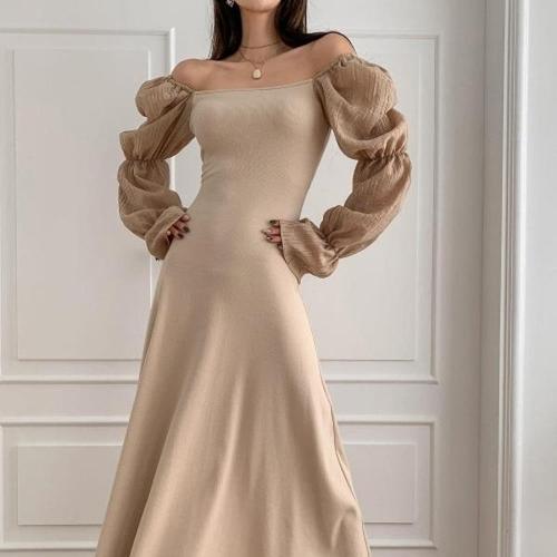 [옷자락]여성 오프숄더 스트랩 슬림 원피스 볼륨 셔링 롱드레스