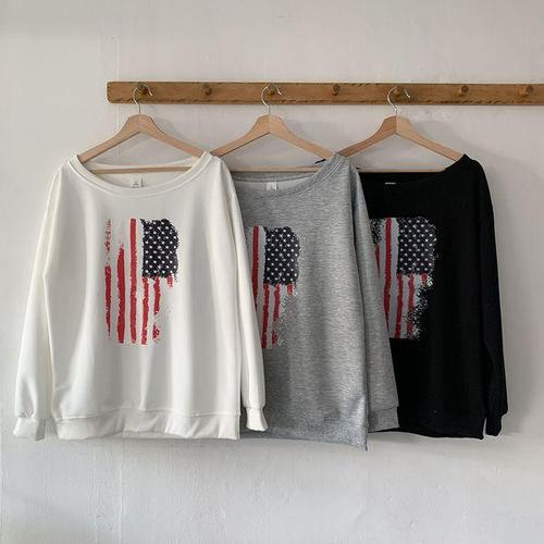 [옷자락]여성 오버사이즈 오프숄더 맨투맨 성조기 프린트 가을용