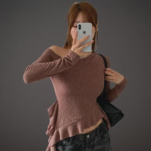 [미라클세븐]여성 슬림핏 오프숄더 프릴 니트 탑 면혼합 언발란스 디자인
