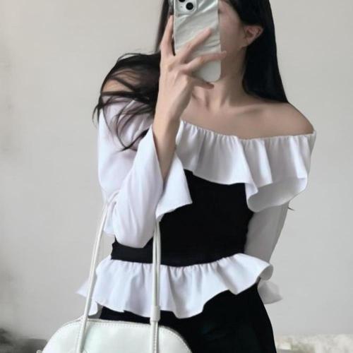 용수철 O넥 긴팔 오프숄더 블라우스, 한국 여성 의류, 분위기 있는 패션 셔츠