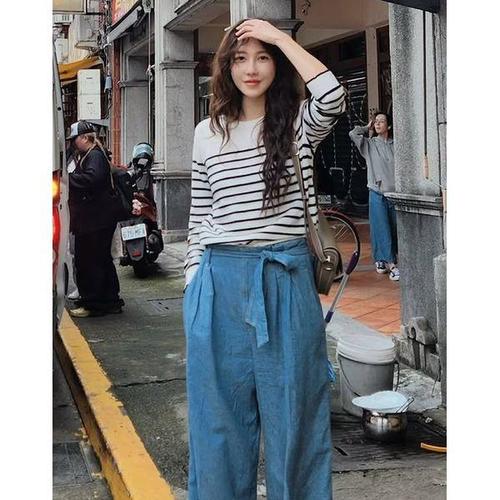 [여성/올리비아로렌] 조직감 있는 스트라이프 캐쥬얼 라운드 니트 티셔츠 VOCBL4W9341