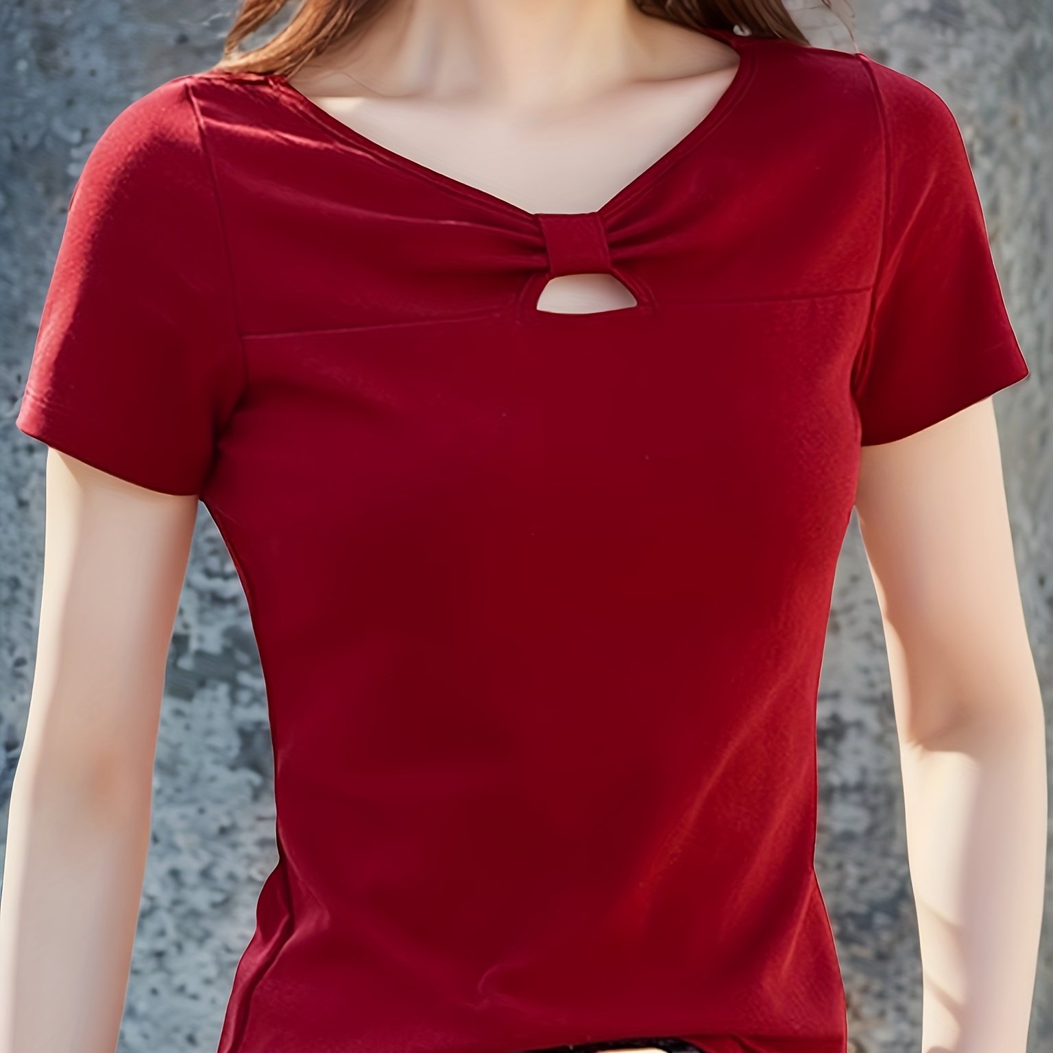 TEMU 여성용 레드 V넥 반팔 상의 - 섹시한 여름 캐주얼 블라우스, 신축성 있는 폴리에스터 블렌드, 기계 세탁 가능, 봄/여름 필수품, 다재다능한 패션 | 키홀 탑 | 거울 같은 질감
