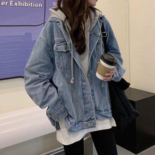 [모노무드]LMO 스타일 심플룩 스포티 걸스 털 이너 세미크롭후드티 데님자켓