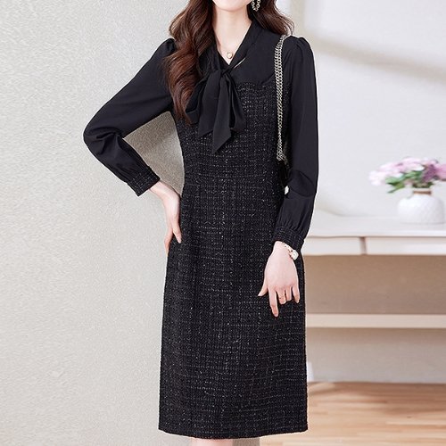검정여성용 이지 원피스룩 주름 H라인 타이트핏 격식룩 드레스