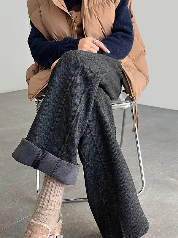 플리스 안감 와이드 레그 팬츠 하이 웨이스트 출퇴근 스타일 바지 가을 겨울 신상 울 바나나 팬츠 스트레이트 컷 슬림 핏