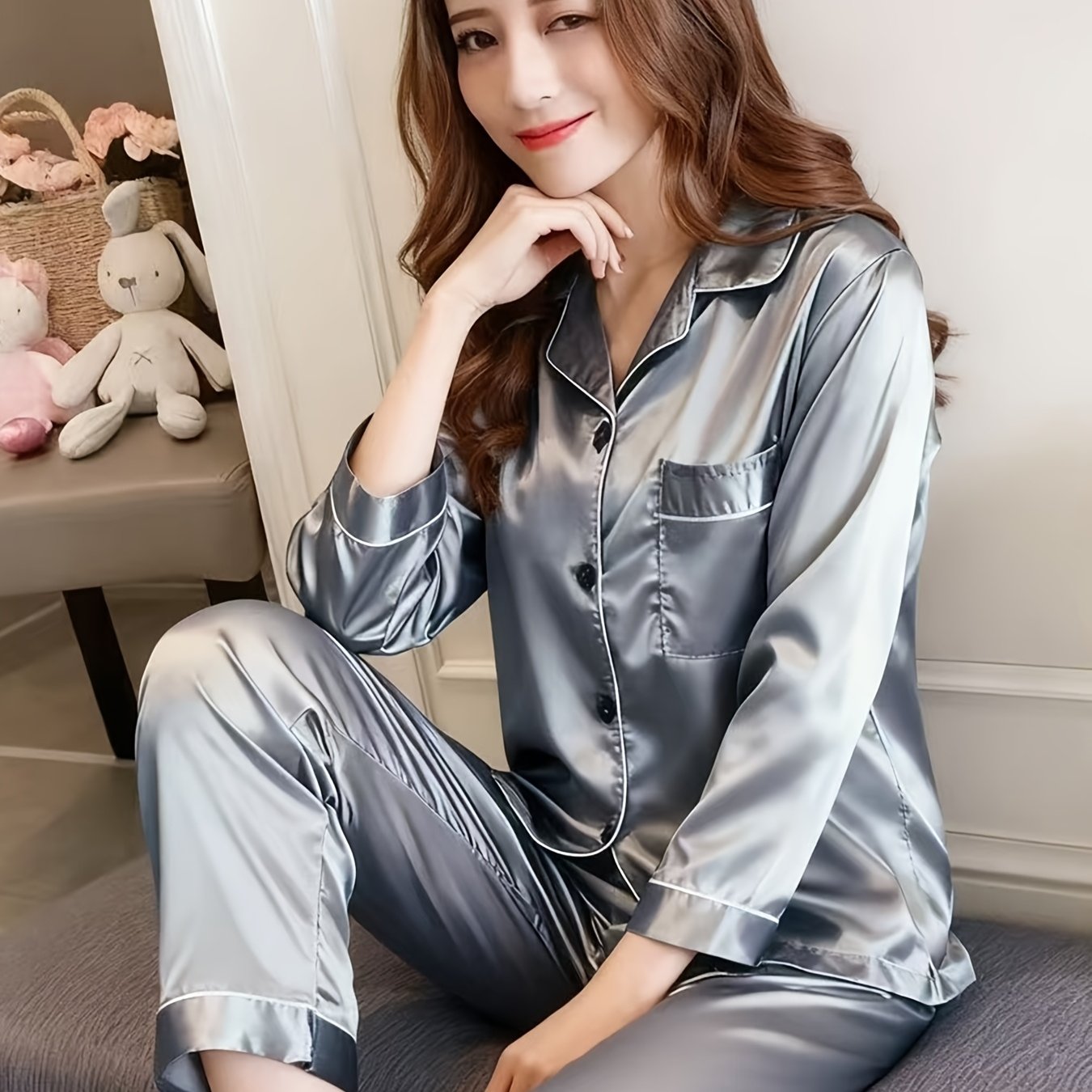 TEMU 고품질 단색 새틴 파자마 세트, 가을 겨울용, 편안한 긴팔 상의와 편안한 허리밴드 바지|여름잠옷