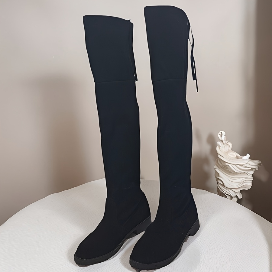 TEMU 여성용 슬립온 니하이 부츠 - 솔리드 컬러 로우힐 토 - TPR 밑창, 라운드 & 패브릭 어퍼 - 웨딩 페스티벌에 적합한 우아한 부츠, 여성 신발