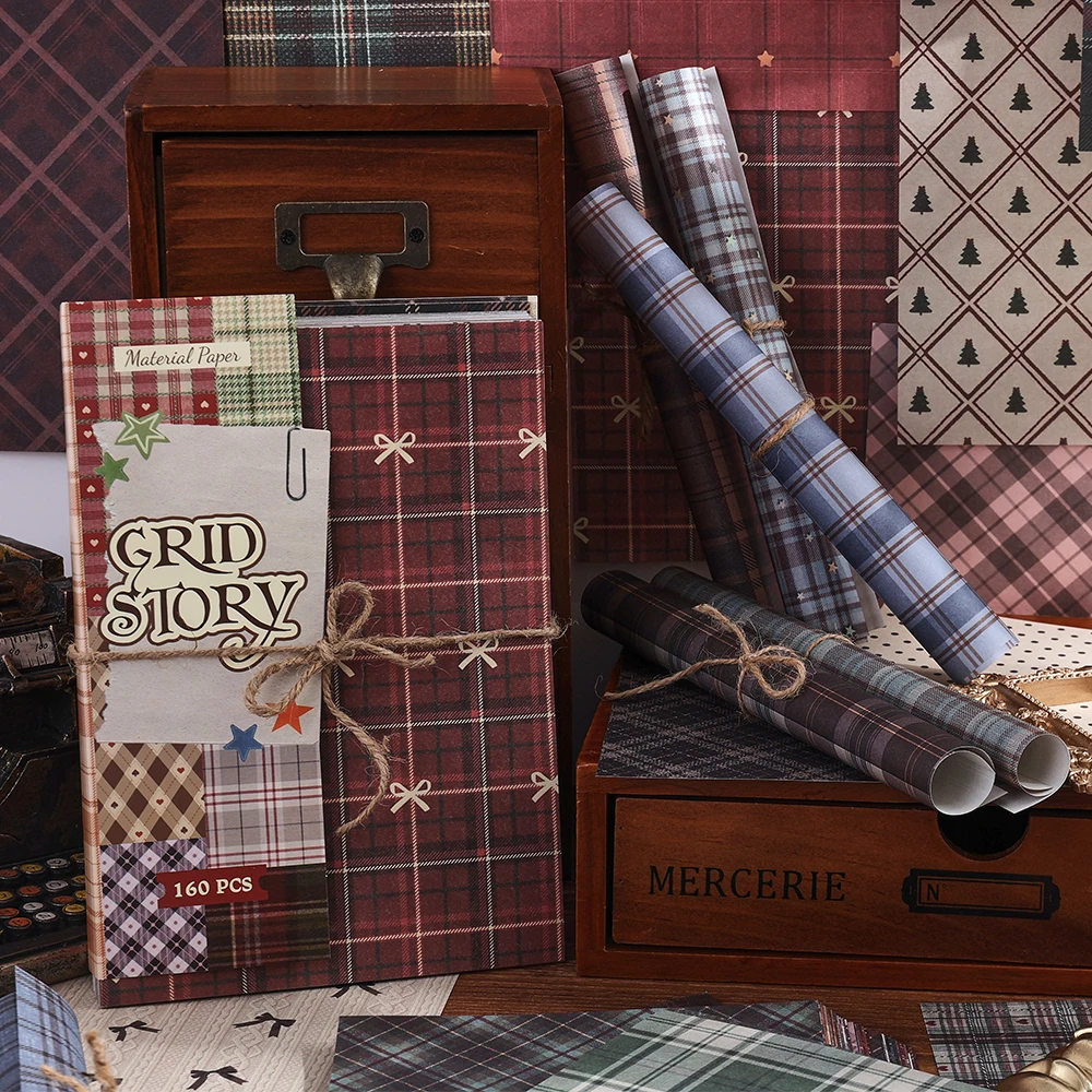 160장 빈티지 그리드 스크랩북 용지, 끈적이지 않는 플래드 패턴 장식 용지, 저널링, 스크랩북킹, DIY 공예용