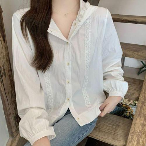 [에이치플러스몰]소녀감성 후드넥 레이스 플라워자수 셔츠 여름 바막