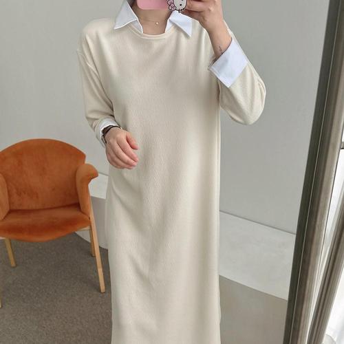 [샵앤][샵앤] 국산 배색 셔츠카라 오버핏 임부복 롱원피스 LL-WDR-4847-베이지