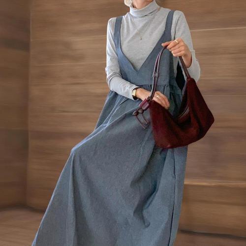 [미라클세븐]여성 박시핏 레이어드 랩 나시 임산부 데님 롱드레스