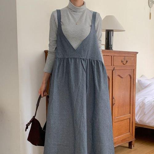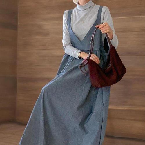 [신상오픈런]여성용 루즈핏 레이어드 랩형 나시 임산부 데님 롱드레스