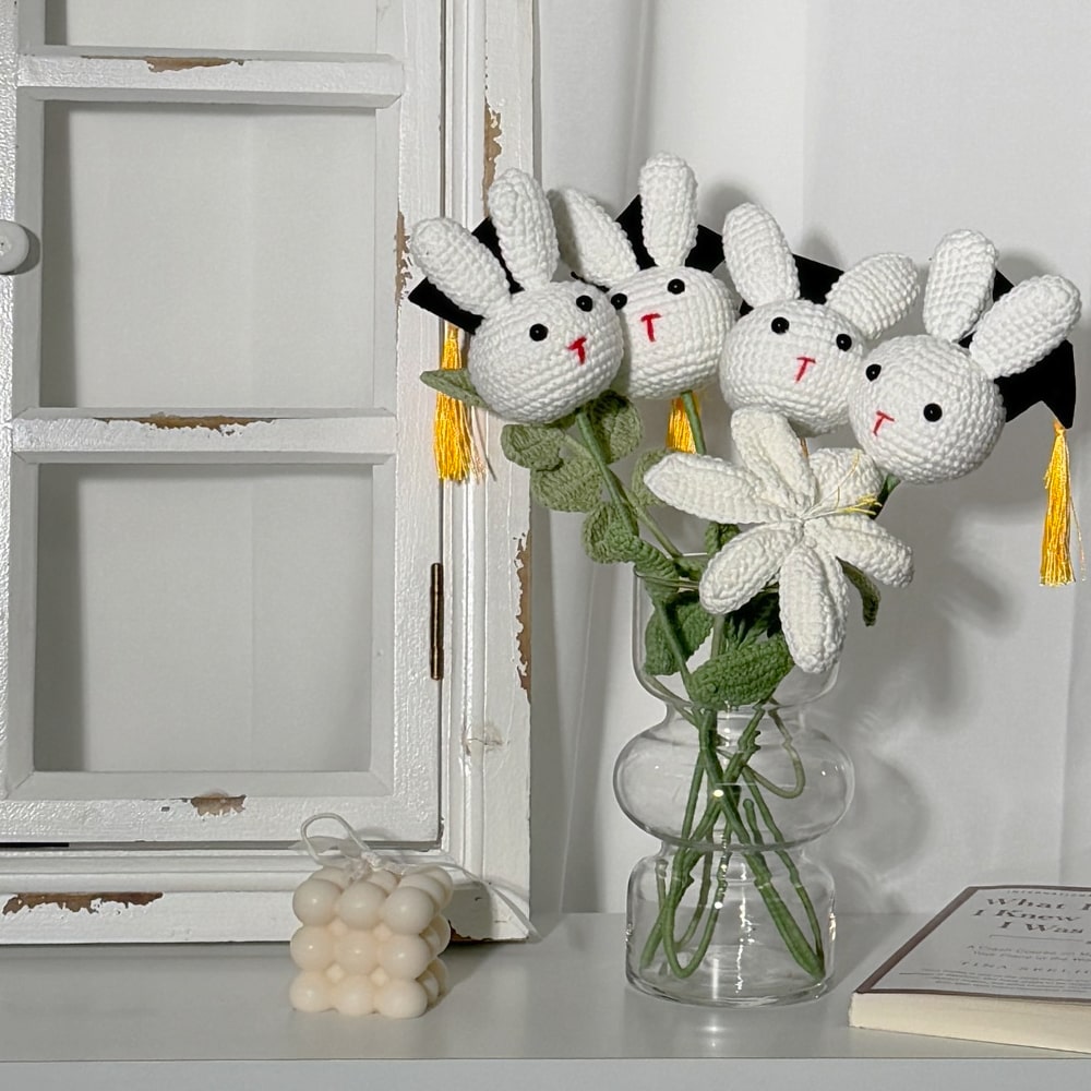 뜨개토끼(학사모) 니트꽃 조화 장식 꽃다발 조화 꽃