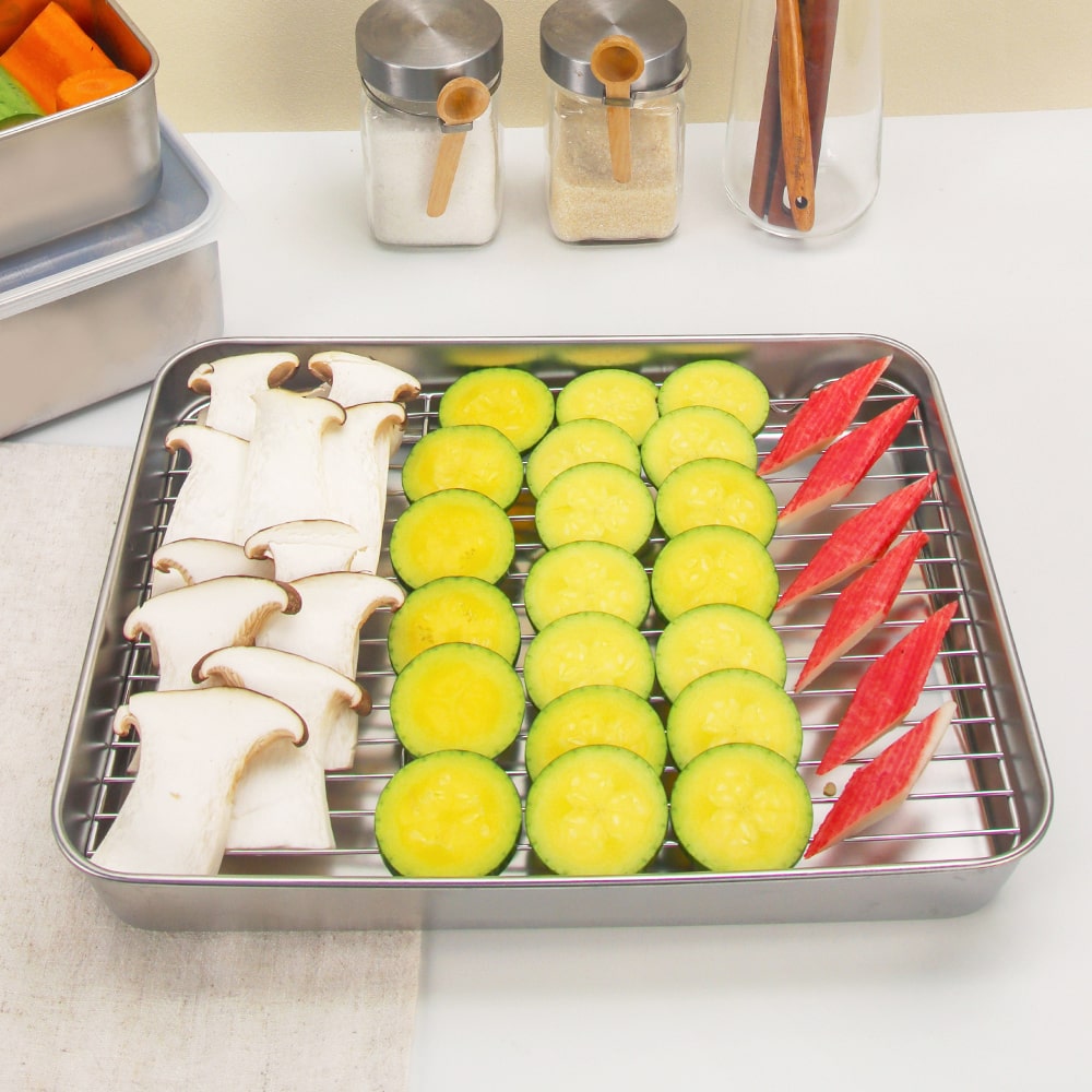 스텐 얕은 사각밧드 트레이 보관용기 뚜껑 거름망포함 대형 2P세트