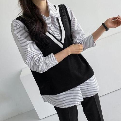 [셀러허브_여성트랜드패션]빅사이즈 604 조끼레이어드줄지셔츠 DBSC576