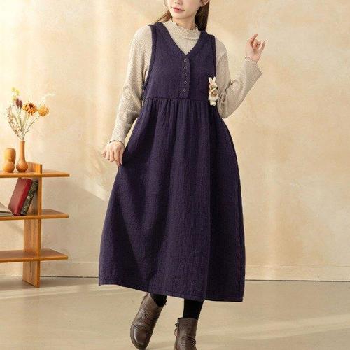 중년여성 레트로 스타일 두꺼운 기모안감 A라인 드레스 골덴 코듀로이 원피스