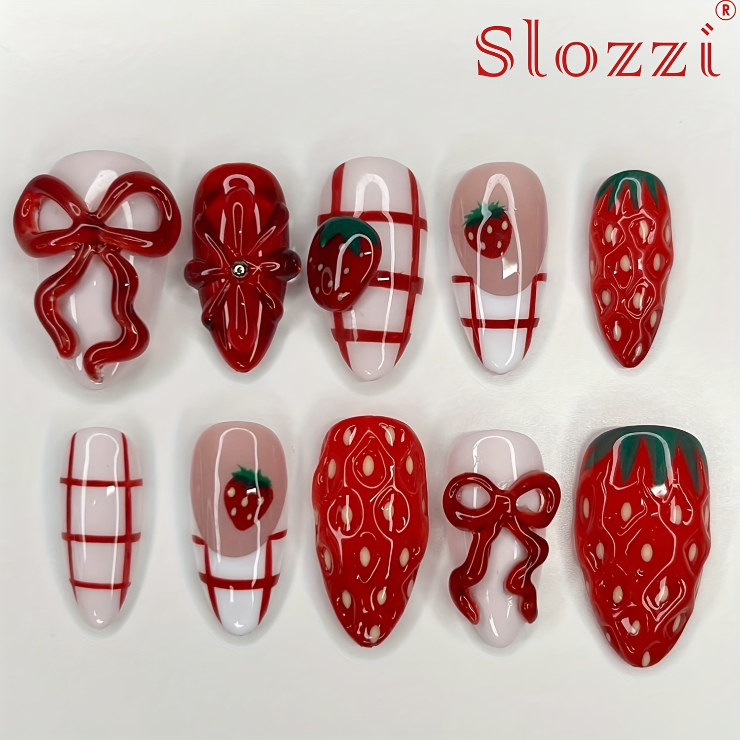 TEMU 10개 SLOZZI 핸드메이드 3D 딸기 & 리본 프레스 네일 - 아몬드형 미디엄 길이 네일, 과일, 광택, 리본 액센트, 여성용 (사이즈 XS/S/M)