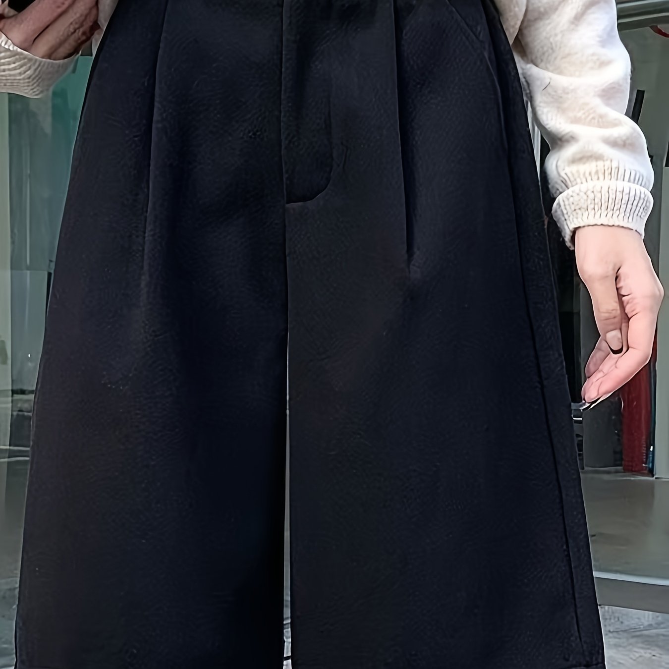TEMU 여성용 한국 스타일 겨울 반바지 - 우아한 한국 영감 와이드 레그 미디엄 길이 모브 트라우저 (벨트 없음) 포켓 & 지퍼 클로저, 세탁기 사용 가능 논스트레치 다크 그레이/블랙 캐주얼 & 정장용 (가을/겨울)