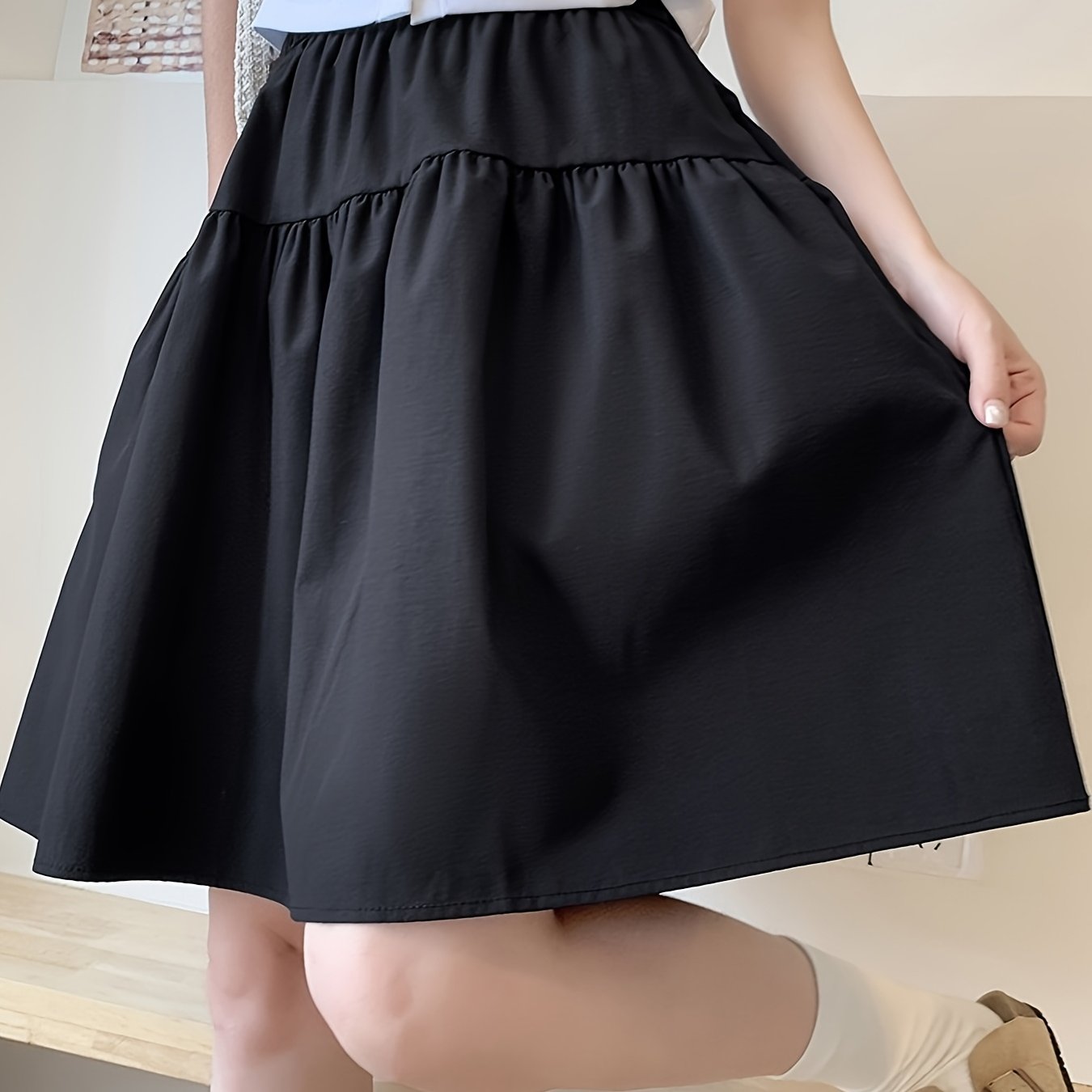 TEMU 솔리드 컬러 미니 스커트, 우아한 플리츠 A라인 블랙 스커트, 데일리 웨어에 적합