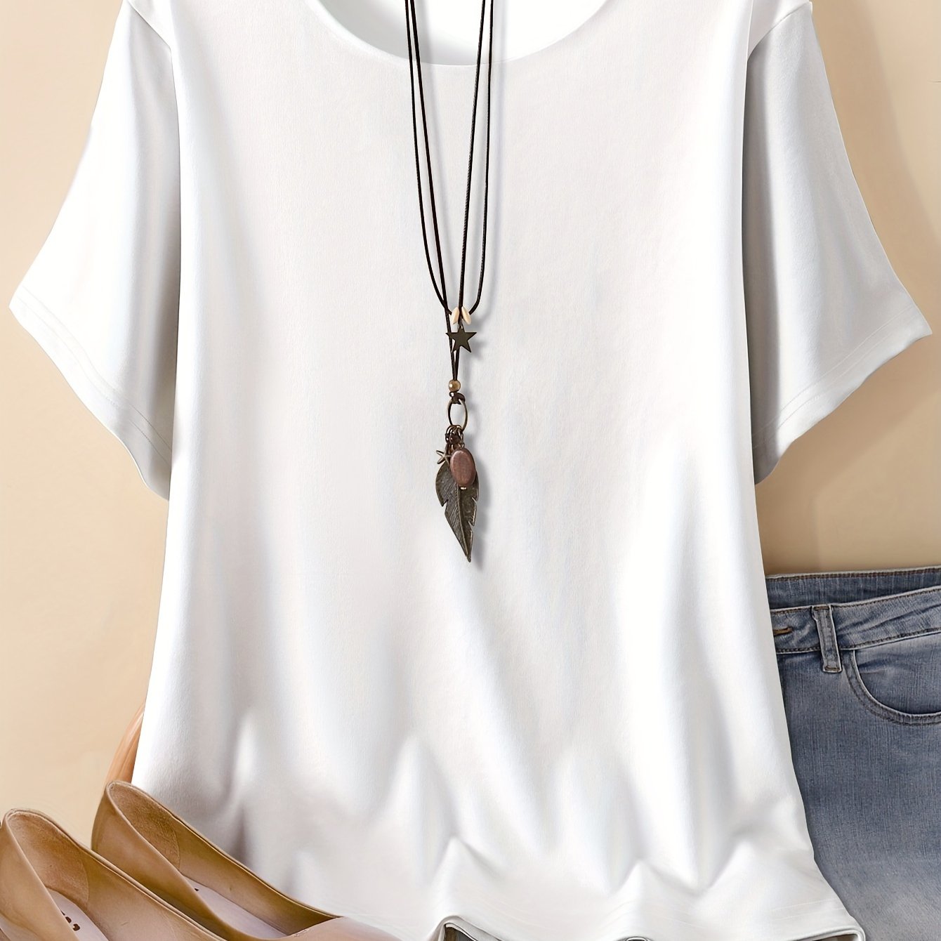 TEMU 여성용 대비 레이스 트림 라운드넥 티셔츠 - 고탄력 캐주얼 탑, 통기성 봄/여름 솔리드 컬러 디자인, 손세탁 전용|블라우스