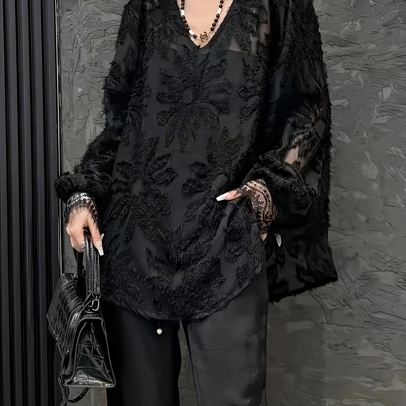 TEMU 플러스 사이즈, 플러스 사이즈 우아한 V넥 긴팔 셔츠 레이스 트림 - 솔리드 블랙 루즈핏 블라우스 봄 여름, 오피스 & 웨딩 의상 - 세탁기 사용 가능, 스톡 사진 참조, xxx에 적합